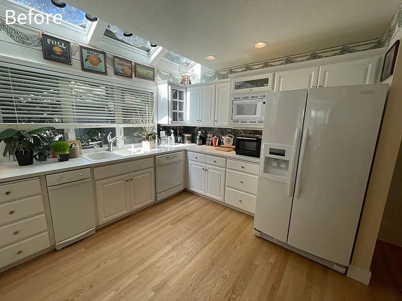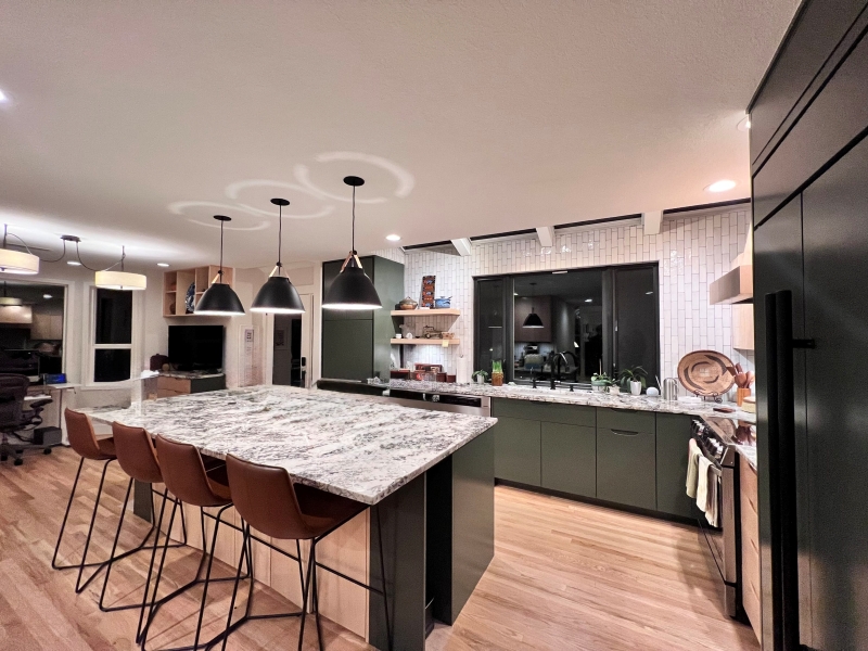 The result is a transformative, full-scale remodel that redefined the home from the inside out. Architectural enhancements played a role in elevating the design. The entry and office ceilings were raised to 14-foot vaults, enhancing light, volume, and spatial presence. In the office, the existing bay window was expanded and reconfigured with oversized windows to flood the space with light, complemented by strategically placed skylights. A new metal roof, seamlessly integrated with asphalt shingles, pairs durability with refined detailing, while cultured stone siding adds depth and texture to the exterior.
